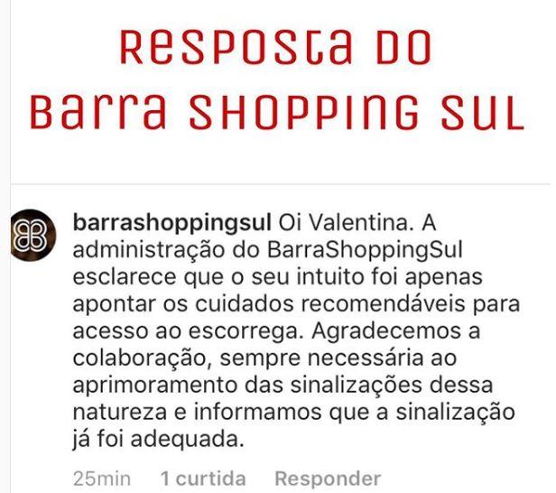 O Instagram do shopping se manifestou sobre o caso em um comentário na publicação de Paula, porém, a pedagoga frisou não ter recebido um pedido de desculpas: “Eles não tinham ideia da responsabilidade daquela placa ao lado do escorregador. Era uma praça para crianças brincarem. Não podem excluir aquelas que têm alguma deficiência”, ela ressaltou em entrevista.