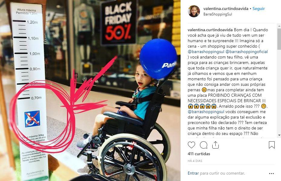 A pedagoga postou a foto da resposta do shopping no Instagram e voltou a comentar: “Vocês já se deram conta quantos eventos de Natal, Páscoa, dia das crianças, vocês simplesmente ignoram as crianças com alguma deficiência? Nem uma mesinha que caiba uma cadeira de rodas embaixo vocês colocam para eles pintarem um desenho. Isso é triste demais.”