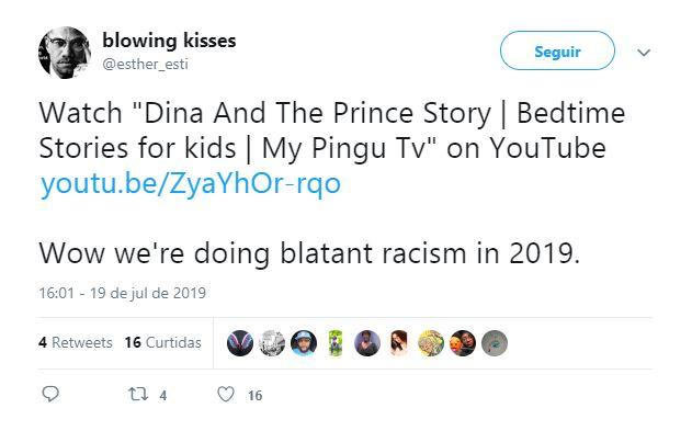 O canal do Youtube My Pingu TV, direcionado ao público infantil, foi obrigado a tirar do ar o desenho “Dina and The Prince”, Dina e o Príncipe, em português, após ser denunciado por racismo.