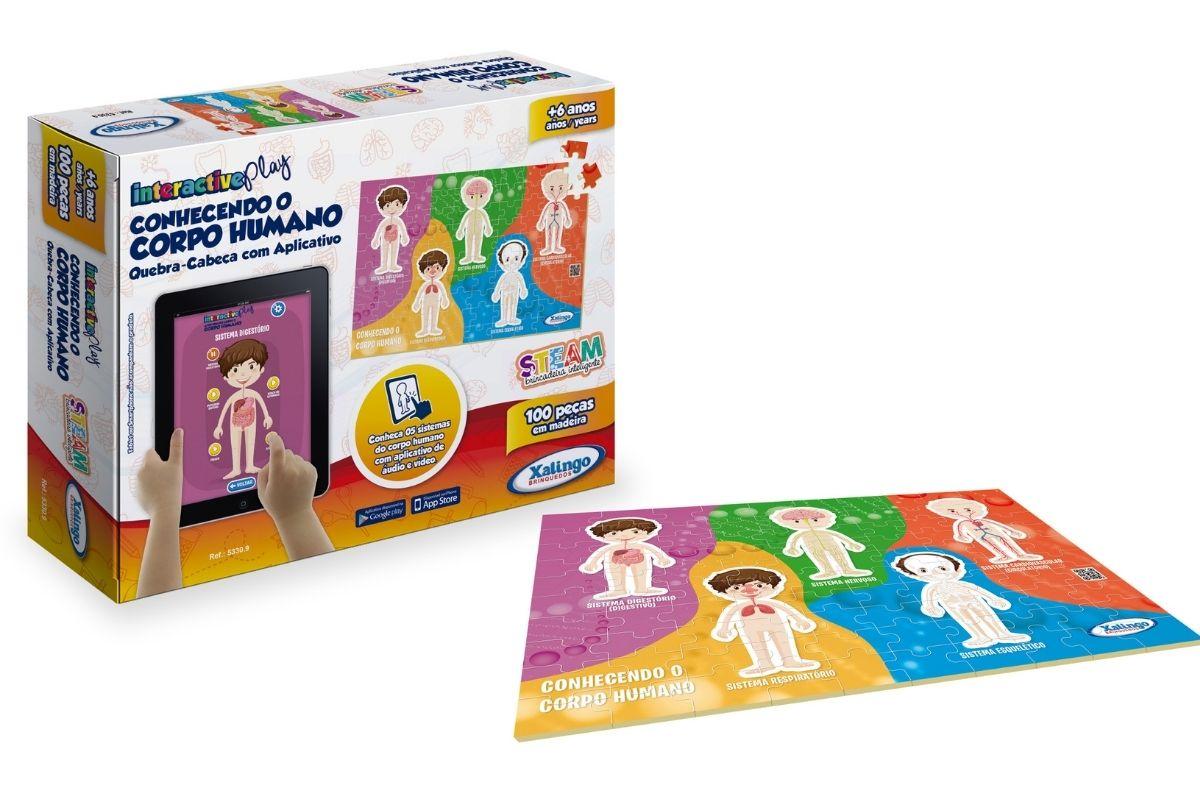 Após montar o quebra-cabeças de 100 peças, a criança usa um tablet (ou um smartphone) para a leitura do QR Code presente no quebra-cabeça. Em seguida, a tela mostra 5 sistemas do corpo (digestivo/digestório, respiratório, esquelético, circulatório/cardiovascular e nervoso) e ela recebe várias informações e ainda aprende algumas curiosidades.