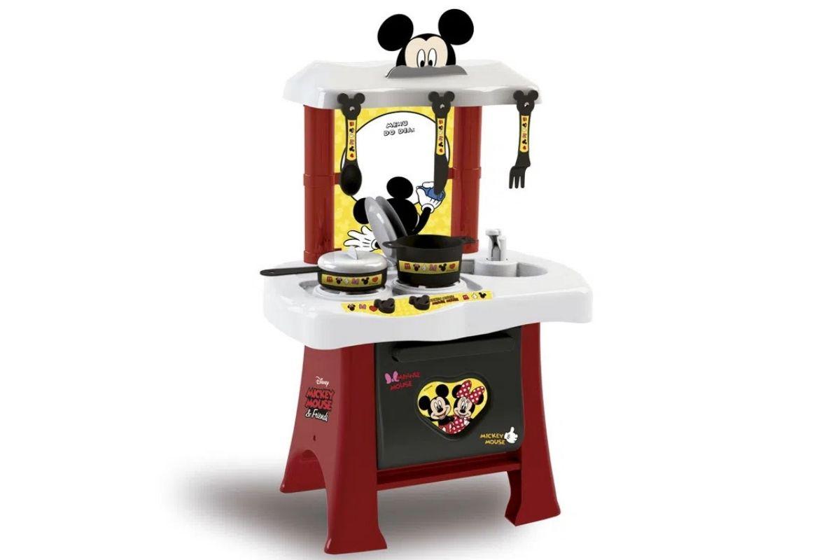 A Cozinha Mickey Disney tem pia, fogão, forno e coifa em um único produto. Ainda acompanha panelas e talheres, sempre seguindo a paleta de cores do Mickey, claro!