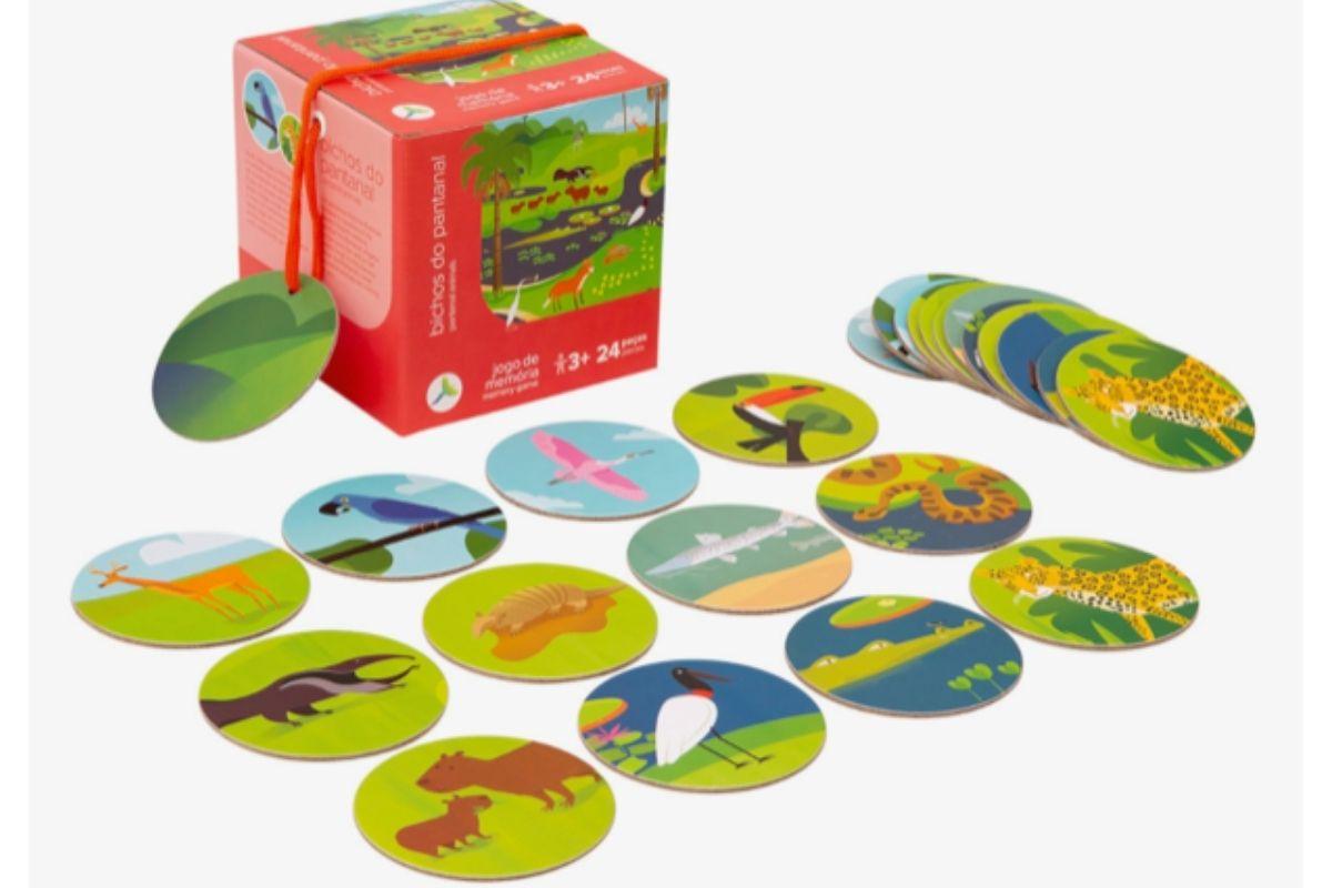 Neste jogo da memória os bichos mais incríveis do Pantanal estão esperando por você e seu filho! Vem com encarte bilíngue (português/inglês) para aprender mais sobre o Pantanal. A ilustração é de Marcello Araujo.