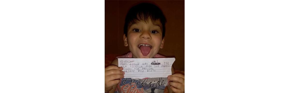 A história do Gabriel, de 5 anos, de Bocaina, em São Paulo, viralizou na internet. A fim de tentar faltar um dia na aula para assistir desenhos, Gabriel fez o pedido para sua mãe, Geovana, que negou. Por isso ele resolveu escrever um bilhete se passando pela sua professora. Nele, o menino citava um feriado, que ele mesmo inventou, e finalizava de uma forma um tanto quanto diferente.