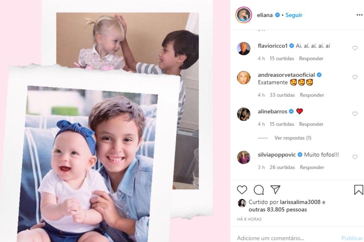Diversos famosos comentaram a publicação. “Muito fofos!”, escreveu a apresentadora Silvia Poppovic. A ex-paquita Andréa Sorvetão concordou com Eliana e escreveu: “Exatamente”. Os internautas também amaram ver a evolução das crianças. “Cresceram tão rápido”, comentou uma seguidora. “Amor de irmão é tudo”, escreveu outra.
