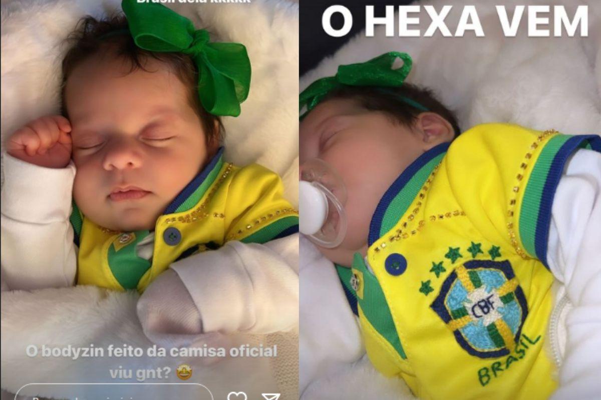 Além disso, nos Stories do Instagram ela mostrou uma sequência de fotos da filha mais nova, Maria Flor. ”A princesa tá play com o look do Brasil dela”. ”O body feito com a camisa oficial viu gente?”