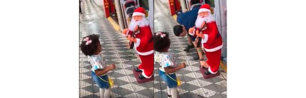 No sul de Minas Gerais, em Pouso Alegre, a ação de um funcionário causou revolta. Em um vídeo postado nas redes sociais, uma menina se diverte com a decoração de Papai Noel dançante da loja. O funcionário se aproxima e desliga o brinquedo.