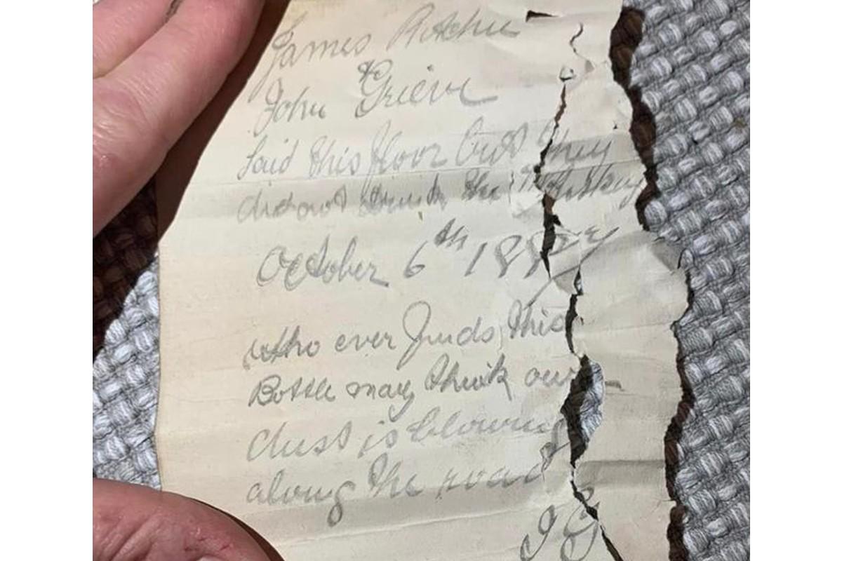 Assinada por dois trabalhadores do sexo masculino, a mensagem dizia: “James Ritchie e John Grieve colocaram este piso, mas não beberam o uísque. 6 de outubro de 1887. Quem encontrar esta garrafa pode pensar que nossa poeira está soprando ao longo da estrada”.