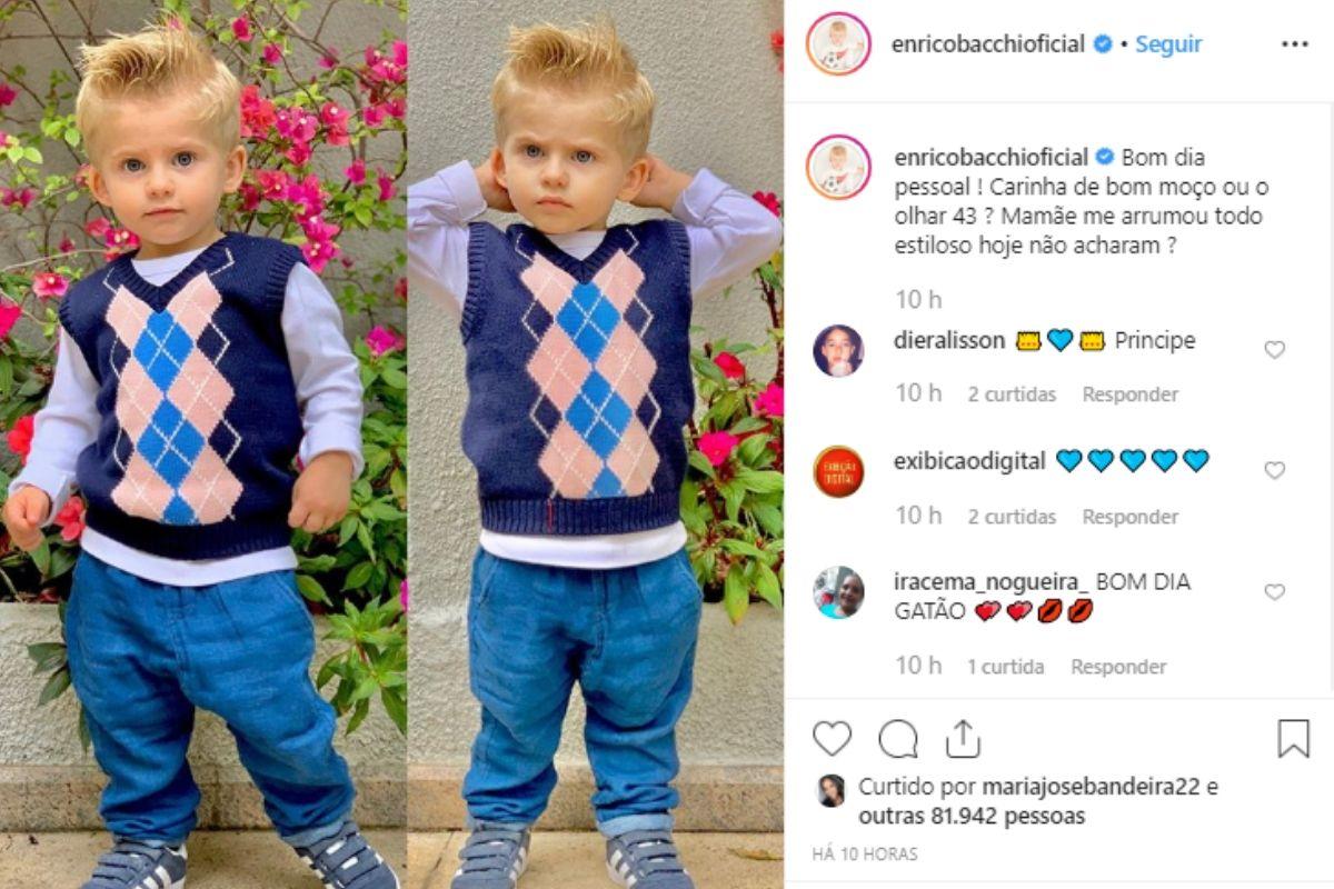Em foto, Enrico aparece vestindo uma camisa social e um suéter xadrez. Muito fofo! “Carinha de bom moço ou o olhar 43? Mamãe me arrumou todo estiloso hoje não acharam?”, escreveu em legenda.