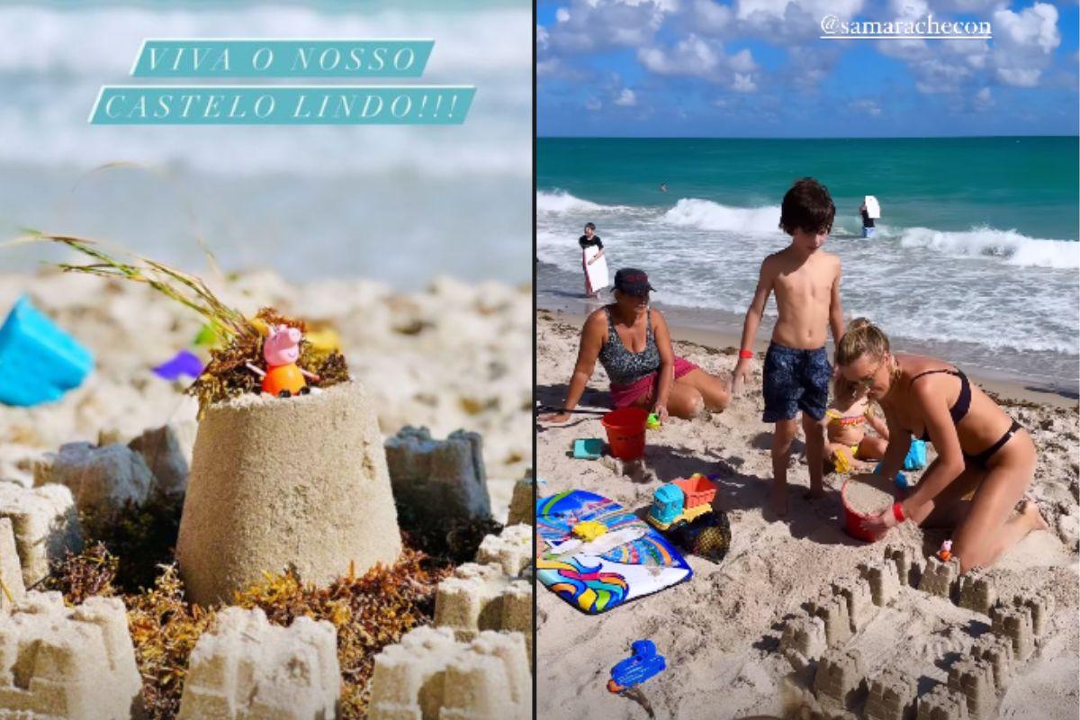 Nos Stories a mãe aparece curtindo um dia de sol na praia e ajudando a família a construir castelos de areia. Em um outro post ela mostrou o resultado final do castelo e escreveu: ”Viva o nosso castelo lindo”.