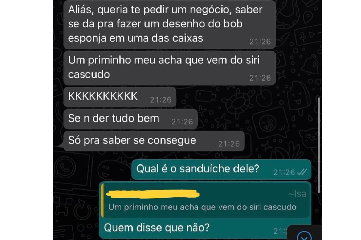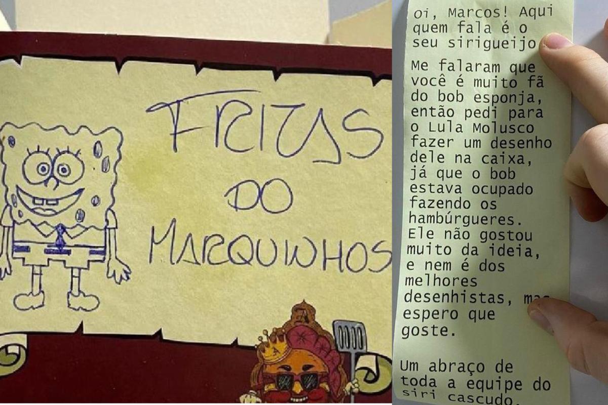 O pedido foi realizado! Os atendentes entraram na brincadeira e desenharam o Bob Esponja Calça Quadrada na caixa de batatas-fritas que acompanhava o hamburguer, e ainda escreveram “Fritas do Marquinhos”. A nota do pedido veio com o recado de outro personagem também muito especial: “Oi Marcos! Aqui quem fala é o Seu Sirigueijo. Me falaram que você é muito fã do Bob Esponja, então pedi para o Lula Molusco fazer um desenho dele na caixa, já que o Bob estava ocupado fazendo os hambúrgueres. Ele não gostou muito da ideia, e nem é dos melhores desenhistas, mas espero que goste. Um abraço de toda a equipe do Siri Cascudo”.