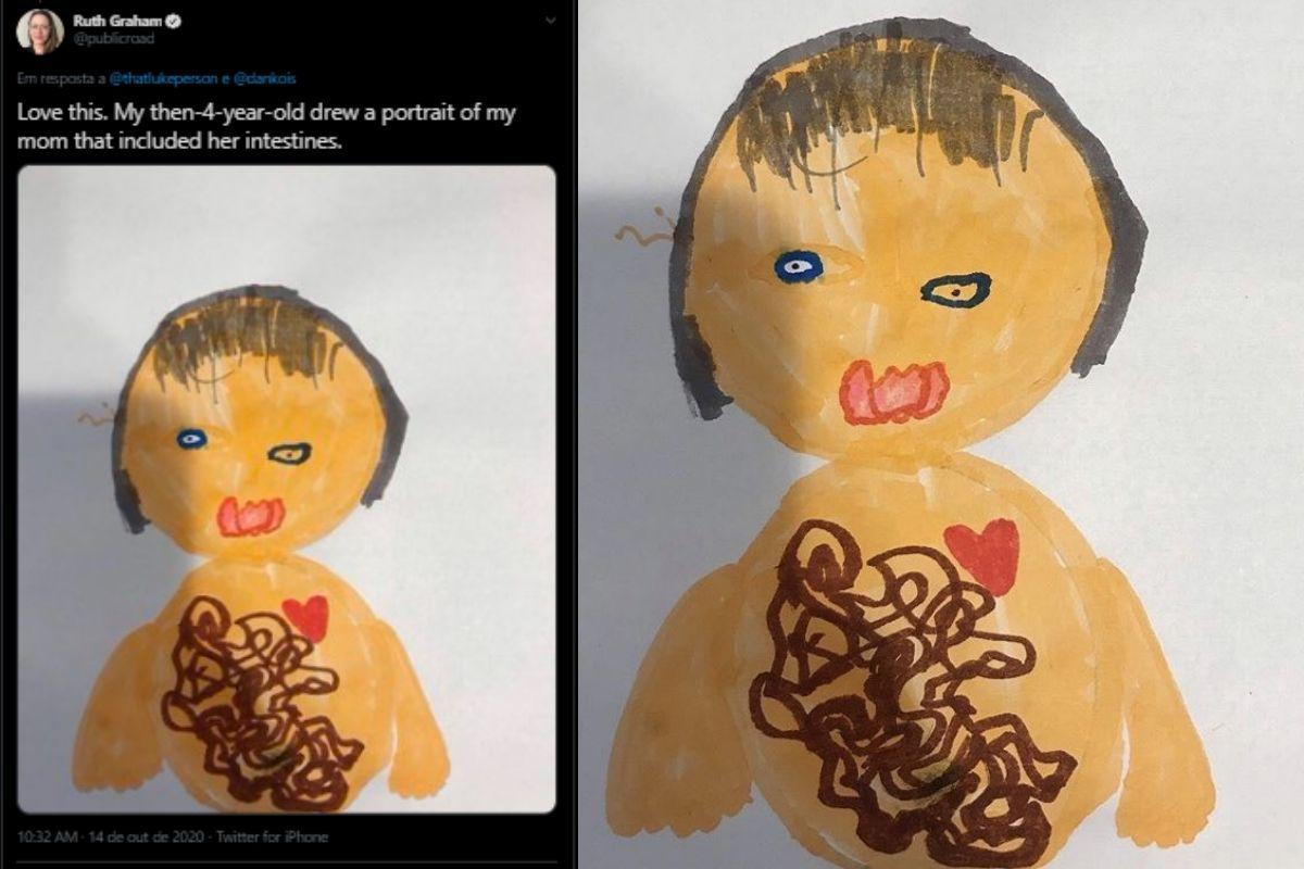 Alguns internautas, ainda, compartilharam os próprios bilhetes incomuns que receberam de crianças ao longo dos anos. Uma garota mostrou o desenho que fez para mãe quando tinha 4 anos. “Meu eu de 4 anos desenhou um retrato da minha mãe que incluía os intestinos”, escreveu ao mostrar o desenho.