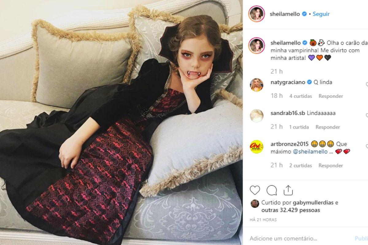 Sheila também se surpreendeu com a reação da menina e comentou sobre isso na legenda da publicação. A garota está deitada de lado no sofá e apoia a cabeça na mão enquanto olha para foto. “Olha o carão da minha vampirinha! Me divirto com minha artista”, escreveu a dançarina.