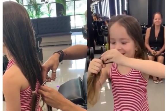 Nas cenas, a menina brinca com as mechas após serem cortadas e Solange completou: “Precisamos ensinar desde muito cedo aos nossos filhos que doar faz bem e é um exercício de desapego. Doar faz um bem não só a quem recebe, faz um bem gigante a quem doa.”.