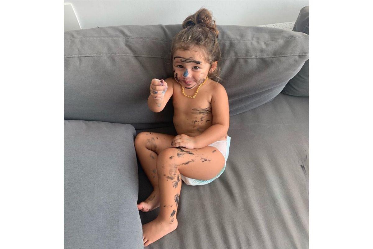 Ela já apareceu comendo terra, comida do cachorro e renovando as plantas de Yanna, mas dessa vez ela se superou e conseguiu se riscar inteira com uma tinta preta. Tanto que a atriz não resistiu e compartilhou uma foto da menina apenas de fralda e toda pintada.