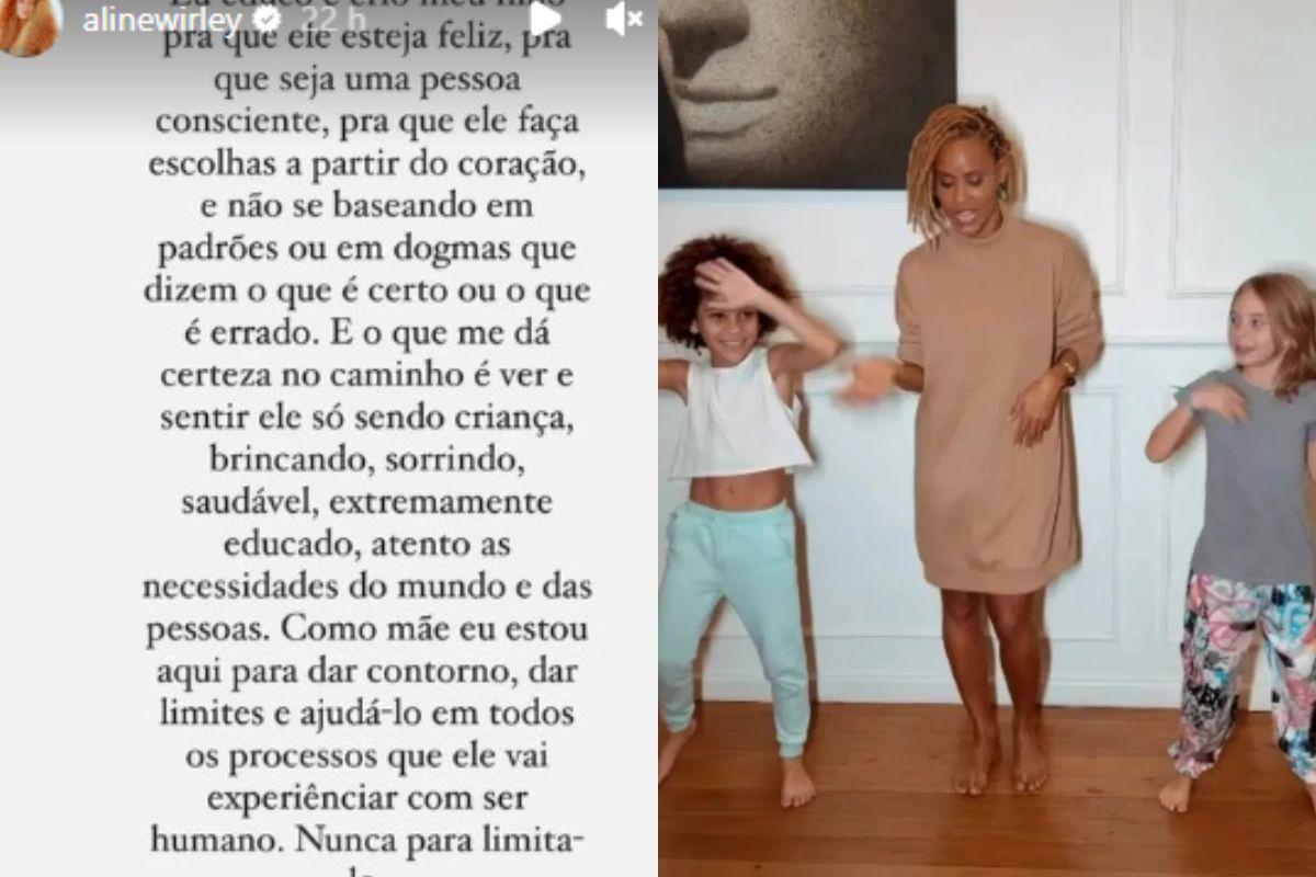 Na última segunda-feira, dia 17 de julho, a Ex-BBB Aline Wirley usou as redes sociais para fazer um desabafo sobre maternidade. Ela é mãe de Antônio, de 8 anos, fruto do atual relacionamento com o ator Igor Rickli. A artista comentou que o filho recebeu diversas críticas após aparecer usando um cropped em um vídeo.