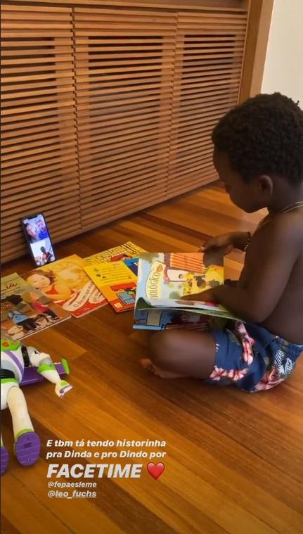 Pelo Facetime, ele leu uma historinha para Fernanda. Com o celular dos pais, o menino, mostrou diversas figurinhas e ressaltou: “Ele é muito fofo!”, sobre a história dos bichinhos do zoológico.