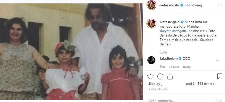 A baiana contou que foi Cynthia quem enviou a lembrança para ele e bateu uma saudadeenorme desse tempo. “Minha irmã me mandou essa foto. Mainha, Cynthia Sangalo, painho e eu. Foto da festa de São João na nossa escola. Tempo mais que especial. Saudade demais”, escreveu a artista na legenda.