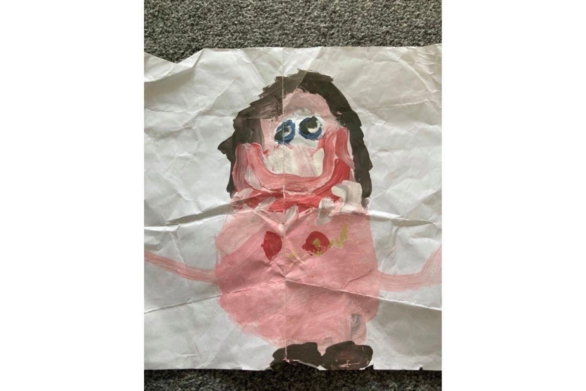 “Depois de uma limpeza recente, me deparei com esta obra-prima que meu adorável filho pintou quando estava na escola infantil. A primeira vez que vi foi em um conselho de classe dele, onde meu pequeno Picasso mostrou, com orgulho, toda a escola, inclusive os pais. Eu ouvia as risadas e queria que o chão me engolisse!”, escreveu.