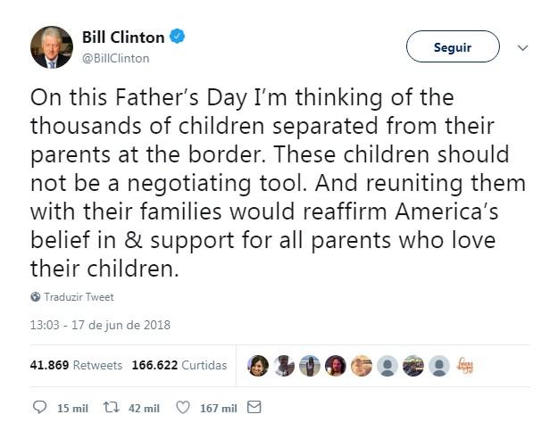 A oposição ao governo Trump, os democratas, chamaram a postura do presidente de “diabólica”. Outras figuras políticas dos EUA também se expressaram por meio do twitter como o ex-presidente Bill Clinton. No último dia 17 de junho, Dia dos Pais nos Estados Unidos, ele disse que estava pensando nas milhares de filhos separados dos pais. “Essas crianças não deveriam ser usadas como objeto de negociação. Reunir essas famílias iria reafirmar a crença americana por todos os pais que amam seus filhos”.