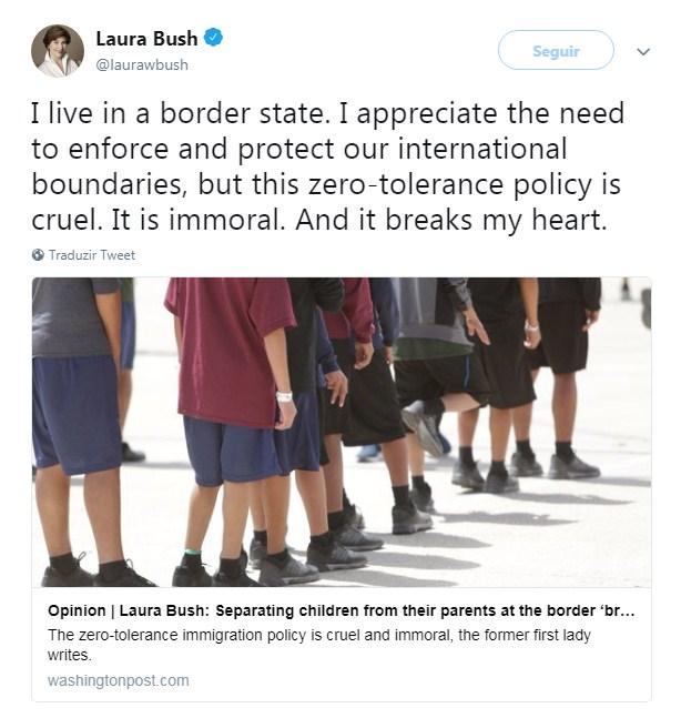 Laura Bush, ex-primeira-dama, esposa do ex-presidente George W.Bush, escreveu sobre a situação para o jornal “The Washington Post”. “Eu vivo em um país com fronteiras. Acredito na necessidade de reforçar e proteger nossas divisas internacionais, mas essa política de ‘tolerância zero’ é cruel. Imoral! Entristece meu coração”, escreveu Laura no Twitter.