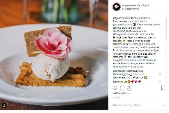 O chef decidiu criar uma sobremesa que leva o nome da filha para ajudar o Instituto Berbigier, uma ONG voltada para doenças raras. O doce está disponível no restaurante do próprio Fogaça, o Sal Gastronomia.