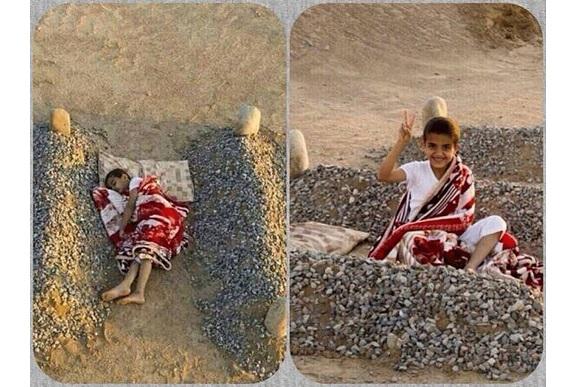 Outra foto feita no mesmo cenário mostra o menino sorrindo entre os “túmulos”, algo que embasa a ideia de que o clique não é espontâneo.