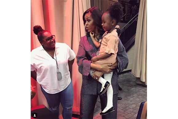 “Antes de o evento começar, eu tive a oportunidade de conhecer e conversar com a mulher da noite sozinha. Parker esperou pacientemente até a fabulosa primeira-dama entrar na recepção e ficou muito feliz quando a viu! Ambas estavam empolgadas de se ver, e eu apenas olhei, com os olhos marejados, observando a Sra. Obama segurar Parker em seu quadril como ela fez em março, quando elas se conheceram.”