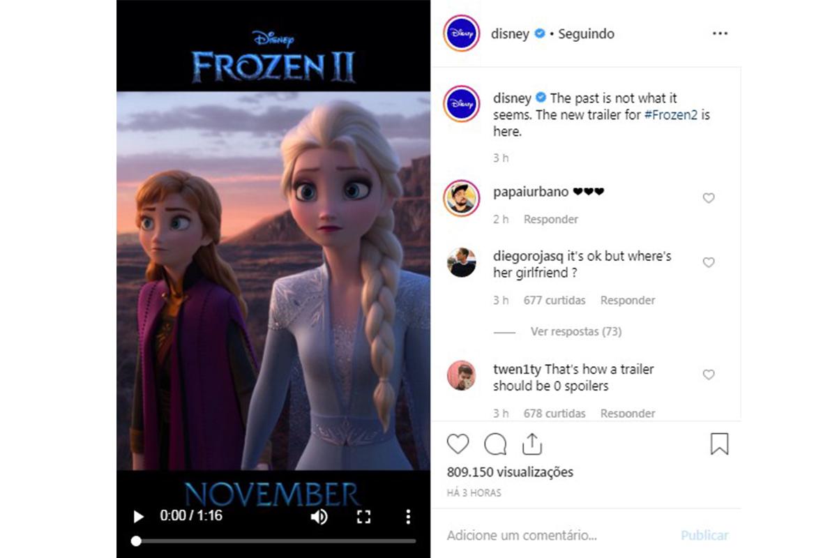 Após publicar no Instagram, a Disney divulgou o vídeo em todas as outras plataformas. O longa conta com a história das irmãs Elsa e Anna numa viagem ao Norte em busca de respostas sobre o antigo Reino de Arendelle e as dificuldades de Elsa em entender a origem de seus poderes. Teremos também a volta das vozes dos atores Kristen Bell, Idina Menzel, Josh Gad e Jonathan Groff. Abaixo você assiste ao trailer dublado: