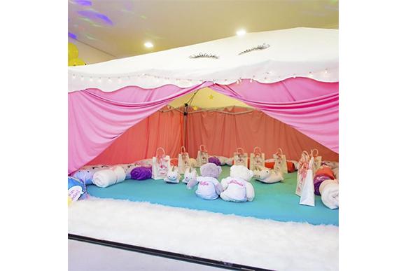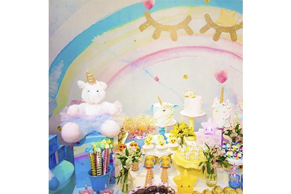 A decoração foi composta por bolos de unicórnio, uma tenda branca e cor de rosa com o mesmo tema, pelúcias menores e uma pelúcia gigante também de unicórnio. As cores e brilhos dourados foram o charme da festa.