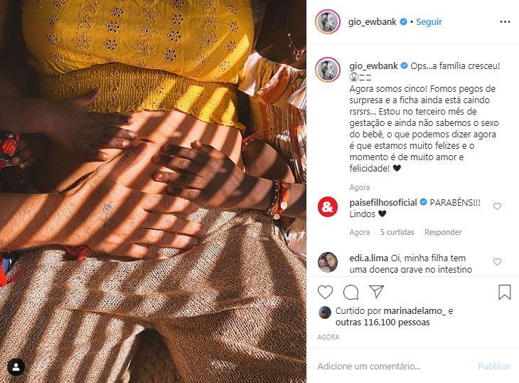 Bruno Gagliasso também compartilhou o anúncio da esposa e comemorou: “Nossa família cresceu. Vou ser papai de novoooo!”, escreveu o ator na legenda da publicação. Giovanna Ewbank e Bruno Gagliasso já são pais de Titi, de 6 anos, e Bless, de 5 anos.