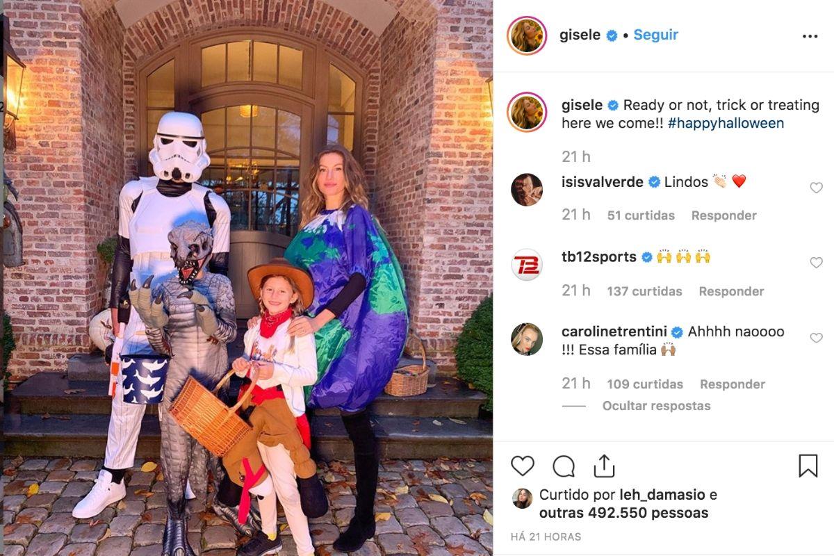 Em publicação, Gisele esta fantasiada de planeta Terra, enquanto Vivian e Benjamin estão vestidos de Jessie, personagem do filme Toy Story, e dinossauro, respectivamente. “Prontos ou não, gostosuras ou travessuras, aí vamos nós”, escreveu a mãe em legenda.