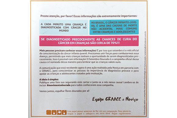 Com informações claras e diretas, o GRAACC, em parceria com Noviça, quer conscientizar as pessoas sobre a importância do diagnóstico precoce. Setembro é o mês oficial da conscientização do câncer infanto juvenil, e o mês ficou conhecido como Setembro Dourado para lembrar dessas crianças que valem ouro!