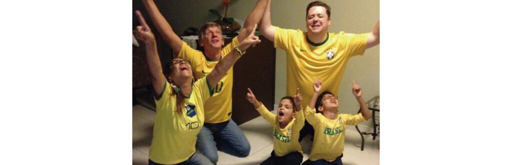“O Gabriel tinha 3 anos quando aconteceu a Copa. Foi a primeira vez para ele. Conseguimos explicar o que era torcer pelo Brasil e ele amou. Cantou o hino pela primeira vez, viu a bandeira e todos torcendo, sofrendo e comemorando! Amou a farra toda. Comemorava quando saía um gol, independentemente de qual time marcasse. Mas, quando o Brasil perdeu de 7 x 1 contra a Alemanha, em 2014, ele ficou triste, assim como o país inteiro. Conversamos com ele e explicamos que nem sempre podemos ganhar. Às vezes perdemos, ficamos triste e depois passa. E, na maioria das vezes tem um time que ganha e outro que perde. Ele entendeu e na hora já saiu correndo feliz para brincar! Esse ano as expectativas estão maiores, ele pediu a camisa da seleção, está fazendo o álbum e já sabe o nome de vários países e jogadores! É muito legal ver essa evolução e o amor que ele tem pelo Brasil.”