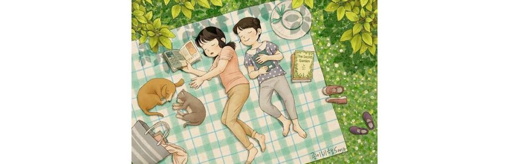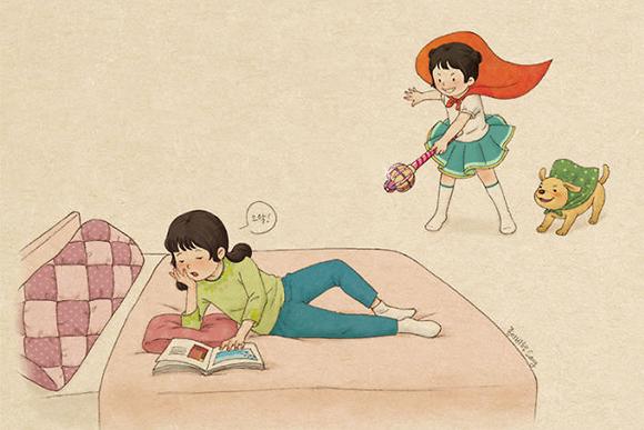 A vida do lado de uma irmã pode ser muito mais leve. Paper Fly, ilustradora coreana, conseguiu retratar com muita delicadeza a amizade e os momentos da sua infância que podem remeter à sua também. São situações simples e cotidianas que se repetem tanto na Coreia quanto no Brasil, como duas irmãs que compartilham a mesma cama, medos, risadas e brincadeiras.