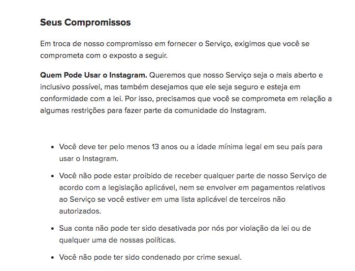 A verdade é que poucas pessoas tem costume de ler as condições e termos das redes socias durante o cadastro. Entretanto, o Instagram tem várias normas a serem seguidas por seus usuários, entre elas, está a permissão de apenas pessoas maiores de 13 anos.