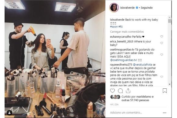 Isis anunciou sua volta com uma foto no Instagram, com a legenda dizendo: “De volta ao trabalho com o meu bebê”. Apesar disso, diversos seguidores comentaram negativamente sobre sua volta e questionaram se ela estava realmente exercendo a maternidade. Uma das internautas comentou: “Gente, já voltou a trabalhar! Mas o bebê precisa tanto da mãe… Não tem cara de quem está amamentando. Que horror!”.