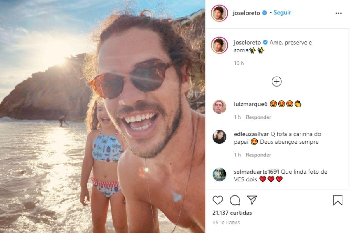 Na imagem, José Loreto aparece sorridente com a filha no mar. “Ame, preserve e sorria”, escreveu ele na legenda da publicação. Diante da imagem, os internautas encheram a família de elogios. “Lindos”, escreveu um. “Ela é sua versão menina”, comparou outro. “Maravilhosos demais”, elogiou um terceiro.