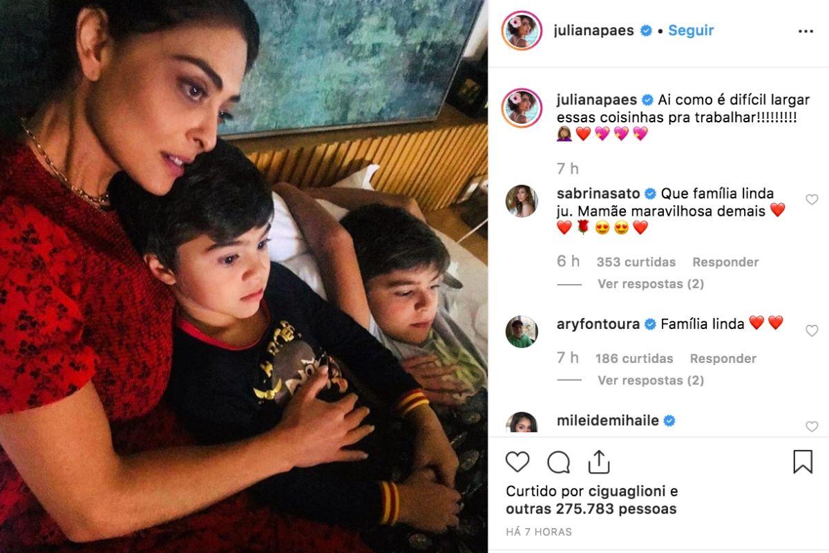 Juliana Paes publicou para os seus 20 milhões de seguidores neste domingo, 18 de agosto, uma foto com seus 2 filhos, Pedro e Antônio.