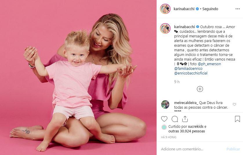 Na terça-feira, 15 de outubro, a apresentadora aderiu à campanha e deixou uma mensagem inspiradora para o seguidores em seu Instagram. Karina publicou uma foto ao lado do filho Enrico, de 2 anos, vestindo rosa e divulgando a importância da campanha.