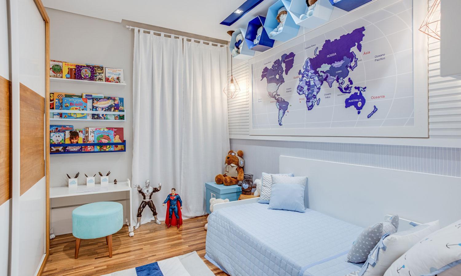Já o quarto do Felipe, com os temas “Amiguinhos”, “Futebol” e “Urso Aviador”, ganhou espaço com tons de azul, brinquedos e acessórios diversos para a imaginação correr solta!