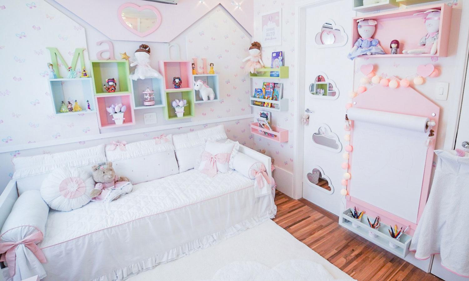 O quarto da Manu tinha decorações com temas “Princesa Clássica”, “Chuva de Amor” e “Bailarina Trapezista”. A paleta de cores tinha tons de branco, que trouxeram um ar de quarto de princesa.