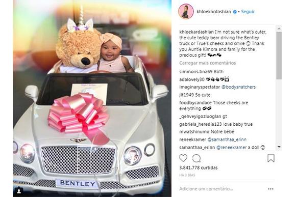 Na foto, a bebê aparece sorrindo no banco do passageiro e segurando um urso de pelúcia gigantesco, maior do que a própria criança. Na legenda, Khloé escreveu: “Não sei o que é mais fofo, o urso de pelúcia ou as bochechas e o sorriso da True. Obrigada Tia Kimora e família pelo presente precioso”.