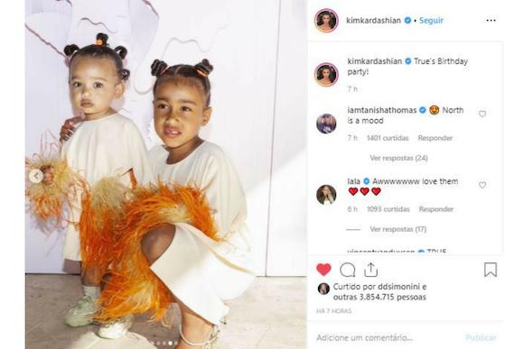 Nas fotos de Kim vemos a bebê com os primos e a tia. True e North, a filha mais velha de Kim, de 5 anos, estavam usando roupas combinando, brancas com detalhes em penas amarelas e laranjas. Até o cabelo das duas estava parecido!