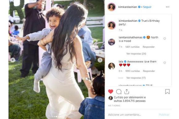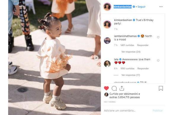 Kim Kardashian postou novas fotos da festa de aniversário da sobrinha, True, filha de Khloé Kardashian e Tristan Thompson. A menina completou 1 ano no dia 12 de abril e arrasou com o look escolhido pela mãe.