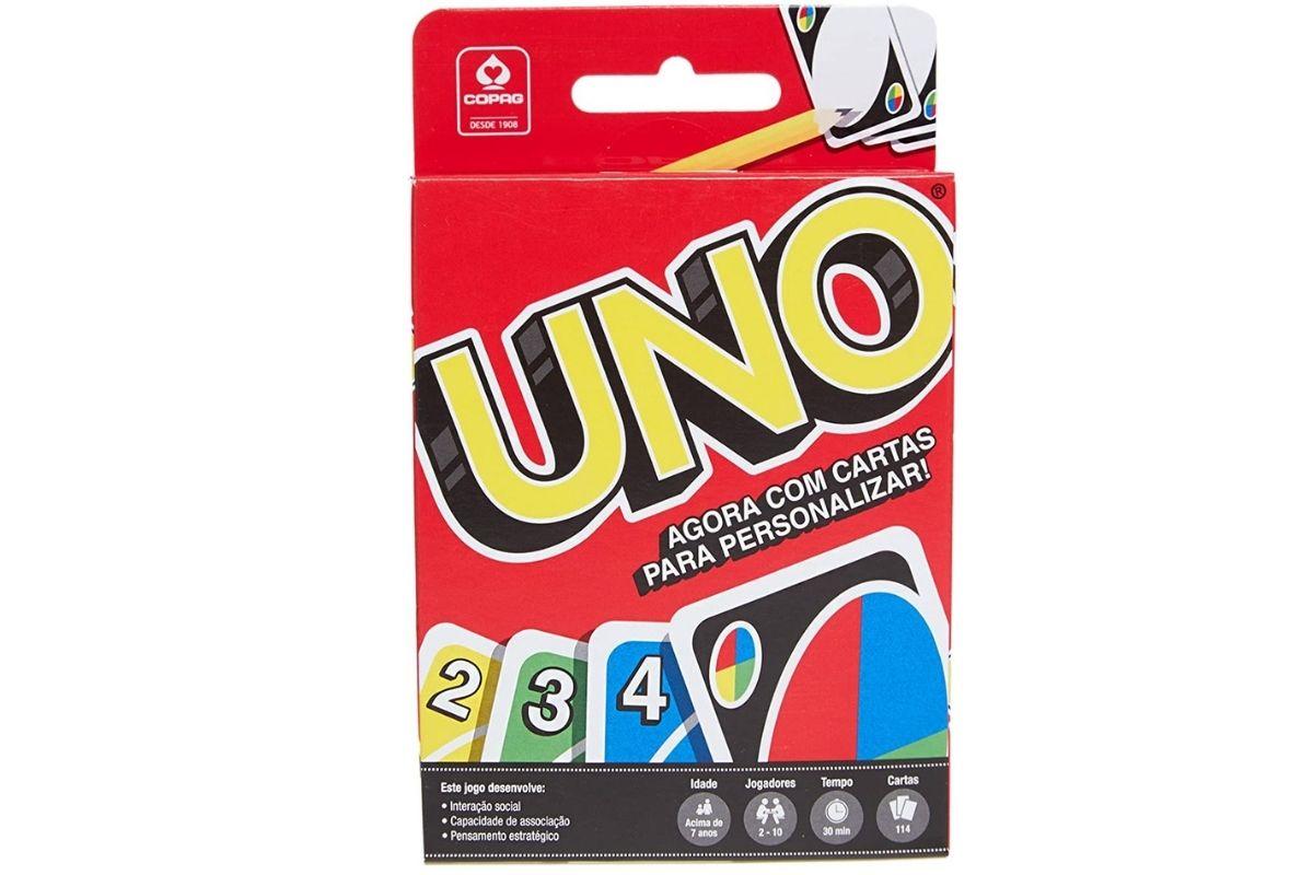 Outro clássico que todo mundo pode brincar junto! Para jogar, é preciso combinar as cartas de acordo com as cores ou o número que está na mesa, mas cuidado! Existem algumas cartas que pedem ações diferentes como pular a vez, mudar a ordem das jogadas e até mesmo comprar mais cartas. Compre na Amazon clicando AQUI, o preço médio é R$ 14,49.