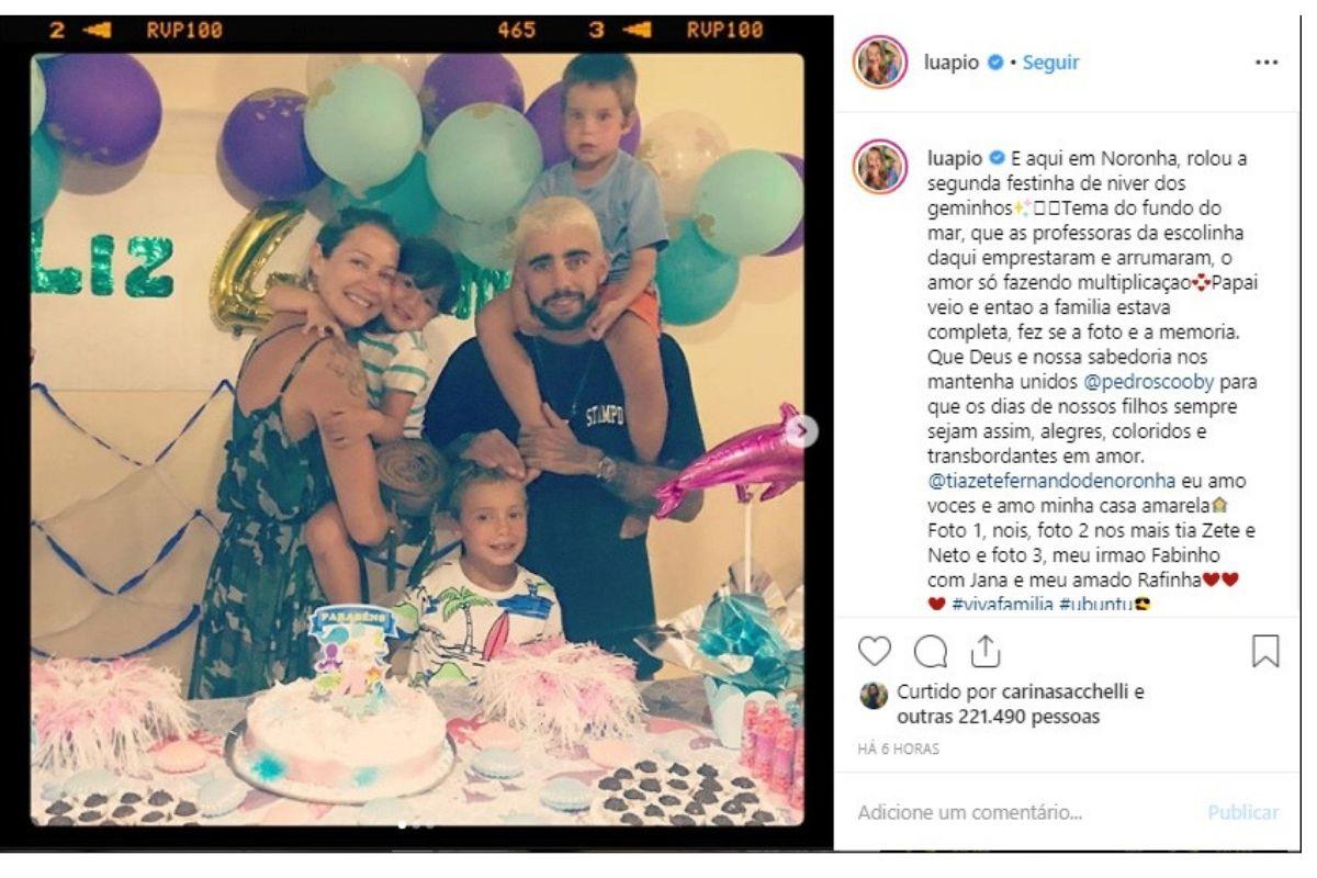 Na legenda da publicação, na qual a família aparece inteira reunida, Luana escreveu: “E aqui em Noronha, rolou a segunda festinha de niver dos geminhos. Tema do fundo do mar, que as professoras da escolinha daqui emprestaram e arrumaram, o amor só fazendo multiplicaçao. Papai veio e entao a familia estava completa, fez se a foto e a memoria. Que Deus e nossa sabedoria nos mantenha unidos @pedroscooby para que os dias de nossos filhos sempre sejam assim, alegres, coloridos e transbordantes em amor”.