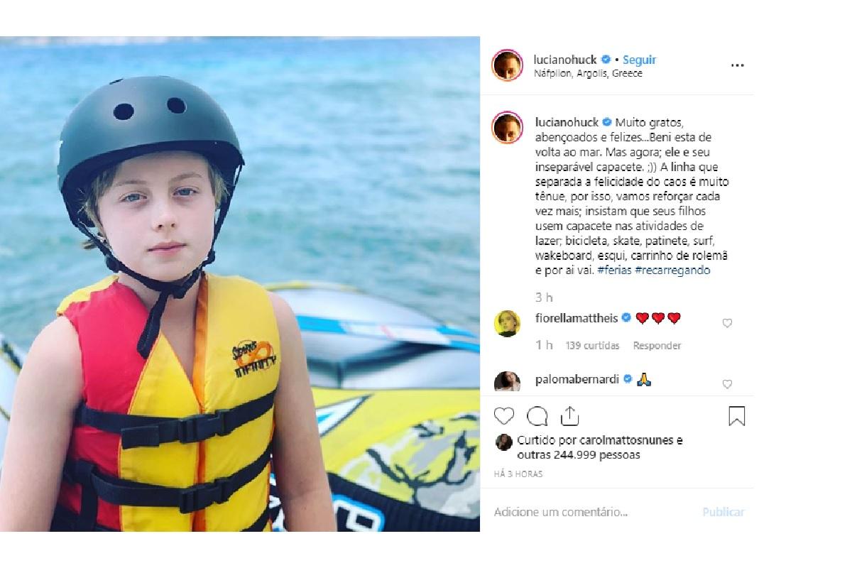 “Muito gratos, abençoados e felizes… Beni esta de volta ao mar. Mas agora, ele e seu inseparável capacete. 😉 A linha que separada a felicidade do caos é muito tênue, por isso, vamos reforçar cada vez mais: insistam que seus filhos usem capacete nas atividades de lazer; bicicleta, skate, patinete, surf, wakeboard, esqui, carrinho de rolemã e por ai vai”, escreveu.