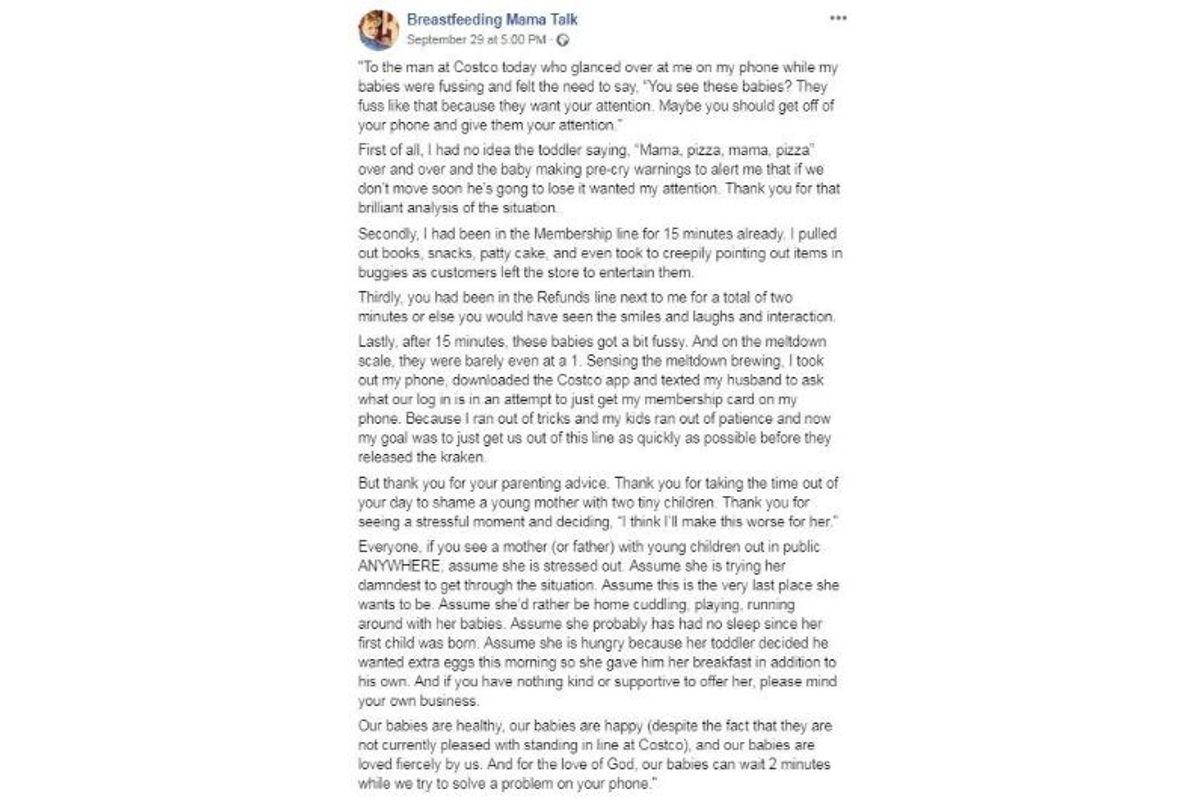 Quando chegou em casa, ela escreveu o relato na página do Facebook “Breastfeeding Mama Talk”, dizendo todas as coisas que gostaria de ter respondido ao homem. Leia o desabafo na íntegra: