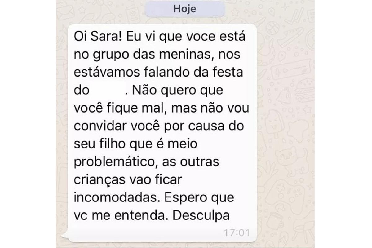 Sara estava em um grupo de mensagens com outras mães e percebeu que elas falavam de uma festa. Ao questionar a mãe sobre a festa, recebeu a mensagem e ficou tão surpresa que nem conseguiu responder. Segundo Sara, as duas eram amigas e não apenas mãe de um coleguinha da escola do filho. “Pensei muito em responder a mensagem ontem, mas estava sem chão. Quando decidi responder, vi que infelizmente me bloqueou em todas as redes sociais”, desabafou Sara no Facebook.
