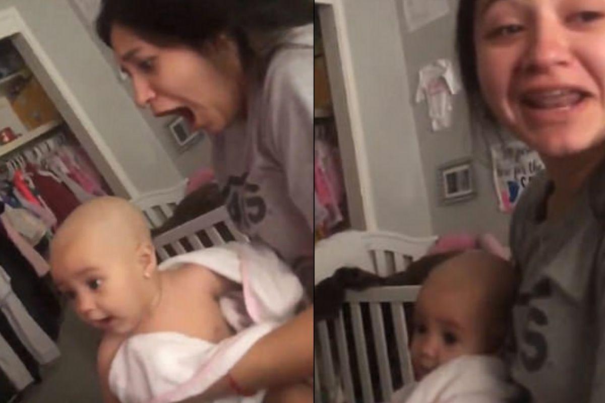 A mãe, após seu cochilo, pegou a filha e começou a brincar, mas nem deu muita importância para a toquinha que estava na cabeça do bebê. Até que Joshua Luevanoz, companheiro de Jasmin, removeu o pano e revelou o novo corte da menina.
